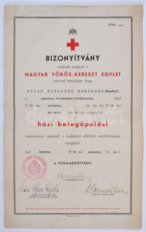 1939 Magyar Vöröskereszt bizonyítvány báró Apor Gizella aláírásával
