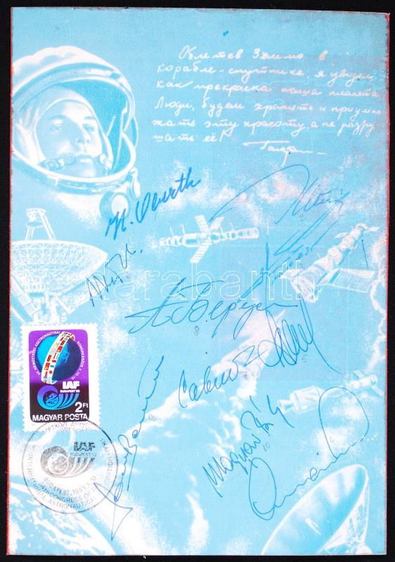 1983 IAF emléklap 10 űrhajós aláírásával: Alberth, Chretien, Hermasevszki, Prunariu, Ivanov, Marek, Szavickaja, Andropov, Farkas Bertalan, Magyari Béla / CM card with signatures of 10 astronauts