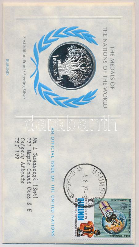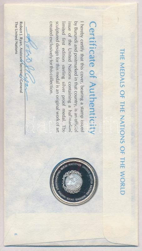 Description: ENSZ 1977. "A Világ nemzeteinek emlékérmei - Burundi" Ag emlékérem (15g/0.925/32mm) megcímzett érmés borítékon elsőnapi bélyegzős bélyeggel, hátoldali tanúsítvánnyal, ismertetőkkel T:PP