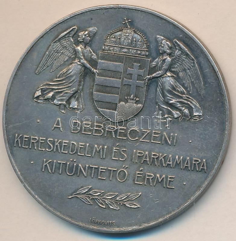 1913. "A Debreczeni Kereskedelmi és Iparkamara Kitüntető Érme" Ag emlékérem, hátlapján gravírozással szign.: LÖFKOVITS (44,41g/0.900/50mm) T:2