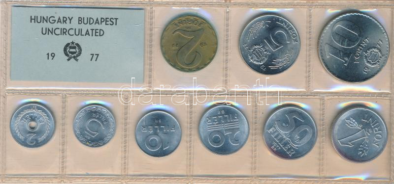 https://www.darabanth.com/en/186-Online-auction/186.0/Numismatics/Hungarian-metal-and-silver-coins~8/1977-2f-10Ft-9db-klf-ermes-forgalmi-sor-foliatokban-T1~II682390