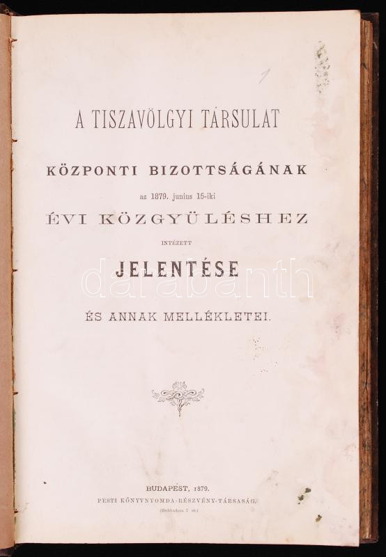 A Tiszavölgyi Társulat központi bizottságának az 1879. junius 15-iki évi közgyüléshez intézett jelentése és annak mellékletei. Bp., 1879, Pesti Könyvnyomda R.-T.; A Tiszavölgyi Társulat központi bizottsága által 1879. évi junius hó 16-án és 17-én rendezett szakértői értezlet eredménye. Összeáll. Gonda Béla. Bp., 1879, Wilckens F. C. és Fia; A duna-tiszai, vagyis a Pest, Szeged, Szabadka és Kula közti csatorna ügyében. Gróf Zichy Jenőtől. Pest, 1868, Emich Gusztáv. Egybekötve korabeli egészvászon kötésbe, 1db térképmelléklettel, a kötés kopott, salétromos