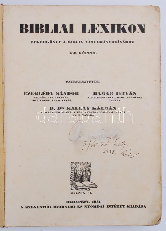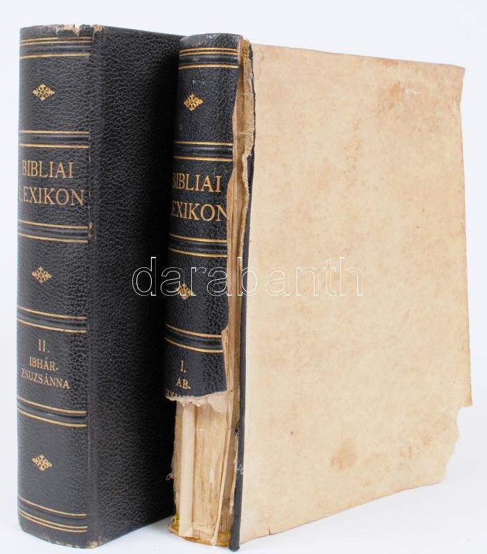 Description: Bibliai lexikon I-II. Segédkönyv a Biblia tanulmányozásához. Szerk. Czeglédy Sándor - Hamar István - D. Dr. Kállay Kálmán. 160 képpel. Bp., 1931, Sylvester. Kiadói, aranyozott egészbőr kötésben, az I. kötet romos állapotú, újrakötésre szorul