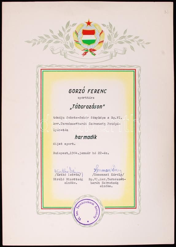 1964 Gorzó Ferenc: Táborozáson. A Természetbarát Szövetség Fotópályázatán 3. díjat nyert fotója oklevéllel, paszpartuzva, 24x35cm