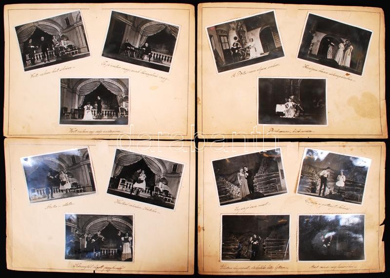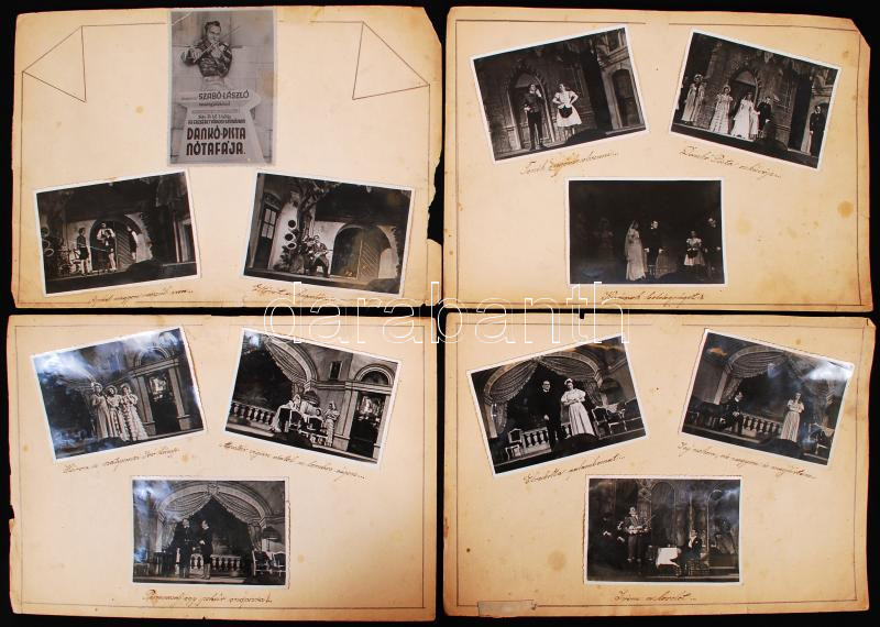 cca 1930 Arányi Kornél "Dankó Pista nótafája" című operettjének budapesti premierjéről készült, 25db-os fotósorozat 8 lapra ragasztva, feliratozva