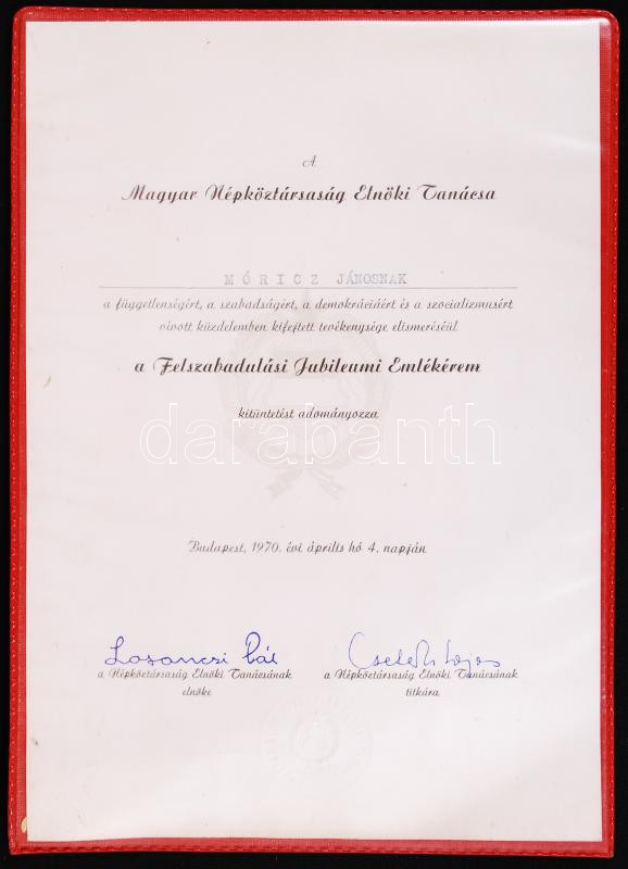 1970 Felszabadulási Jubileumi Emlékérem adományozó okirat Losonczi Pál...