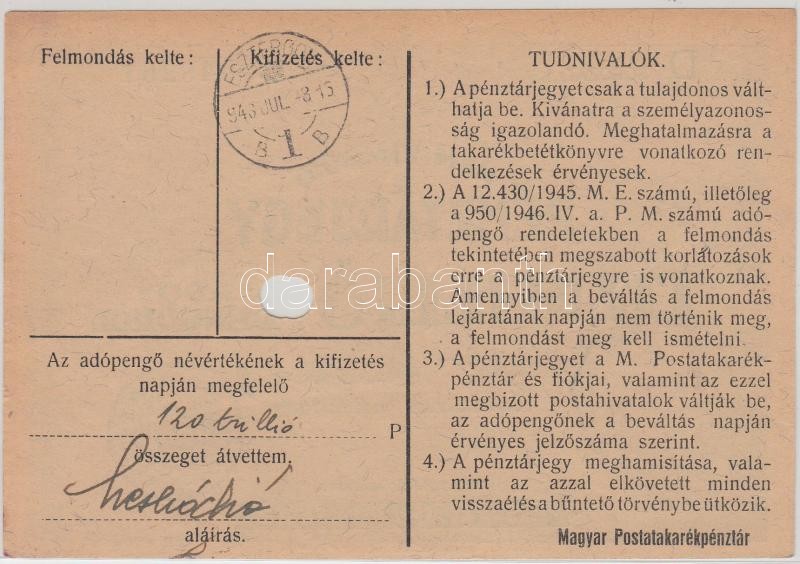 Description: 1946. 10.000.000AP nem kamatozó Pénztárjegy "Másra Át Nem Ruházható" és "M.Kir.Postatakarékpénztár Főpénztár 1946. Jul.4." felülbélyegzéssel és lyukasztva T:I-