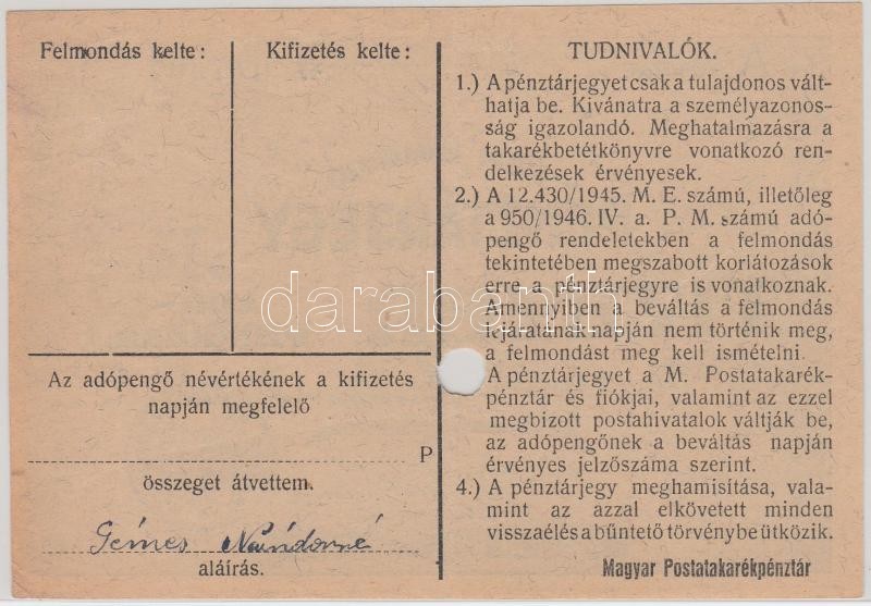Description: 1946. 10.000AP nem kamatozó Pénztárjegy "Másra Át Nem Ruházható" és Székesfehérvár 1946.jun.23.." felülbélyegzéssel és lyukasztva, tulajdonos által aláírva T:II