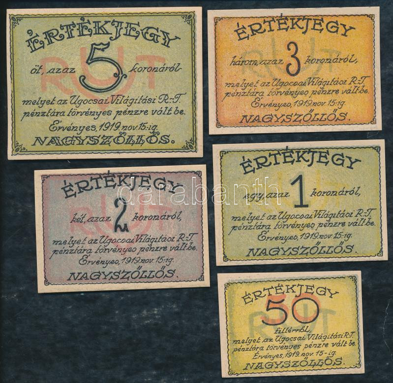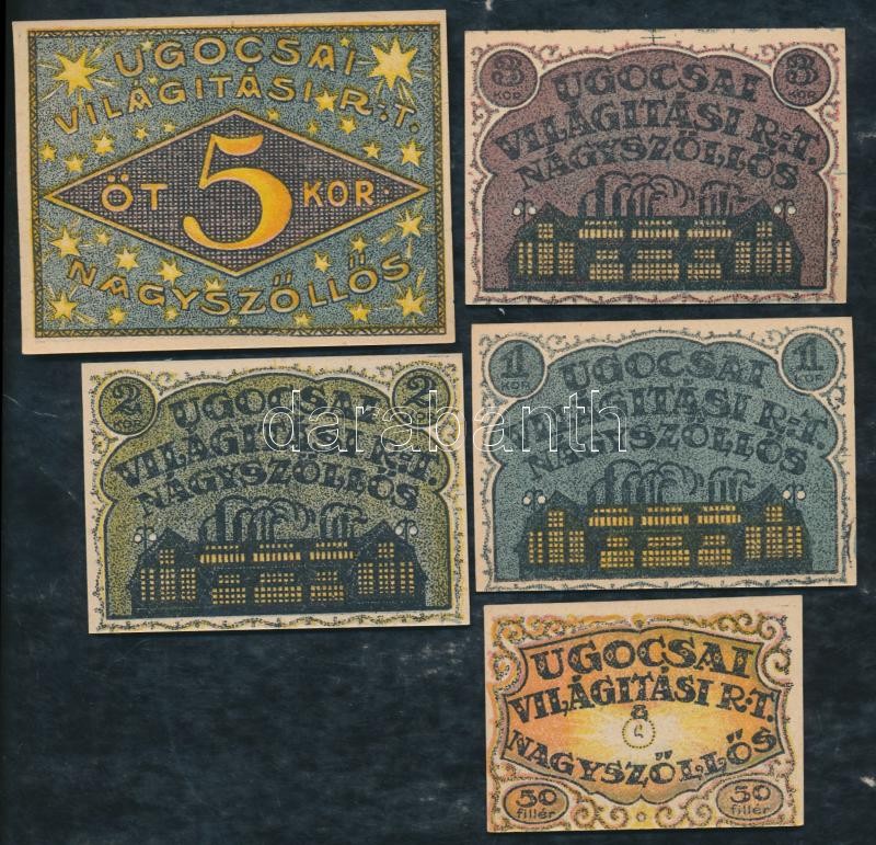 https://www.darabanth.com/en/187-Online-auction/187.0/Numismatics/Hungarian-and-foreign-emergency-notes-and-coins-tokens~6/Nagyszollos-1919-Ugocsai-Vilagitasi-Rt-ertekjegy-50f-1K-2K-3K-5K-5db-boritekban-T~II685664