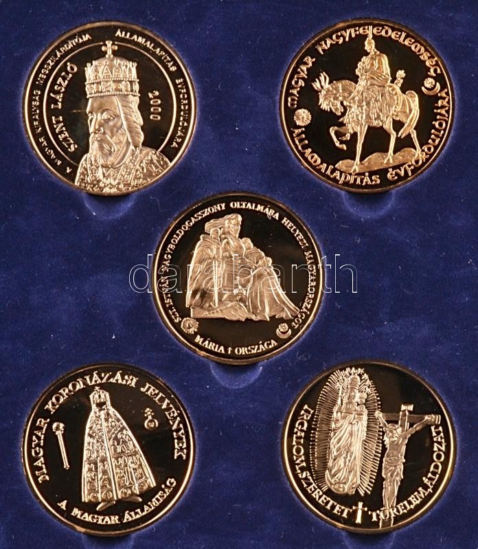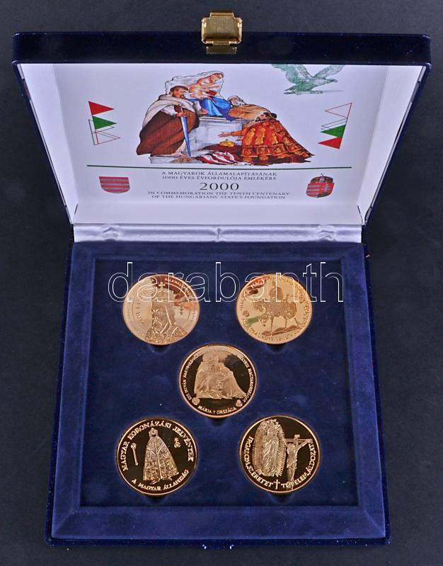 Description: 2000. "A Magyarok Államalapításának 1000 Éves Évfordulója Emlékére - Szeri Gyűlés / Géza Nagyfejedelem emlékére / Szt. István Államalapító emlékérem / Magyar Koronázási jelvények / A Magyar Állam megszilárdítója emlékérem" 5db aranyozott emlékérem (42,5mm) eredeti dísztokban tanúsítvánnyal T:PP Csak 5000db!