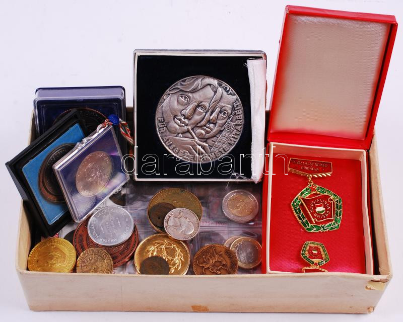 Vegyes numizmatika tétel érmékkel, berakókkal, emlékveretekkel, eurókkal, kínai pénzekkel és egyéb darabokkal Sokol rádiós dobozban T:vegyes