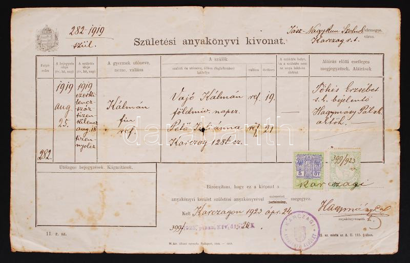 https://www.darabanth.com/en/187-Online-auction/187.0/Other-collectibles/Documents~6000015/1923-Szuletesi-anyakonyvi-kivonat-karcagi-illetekbelyeggel~II690152