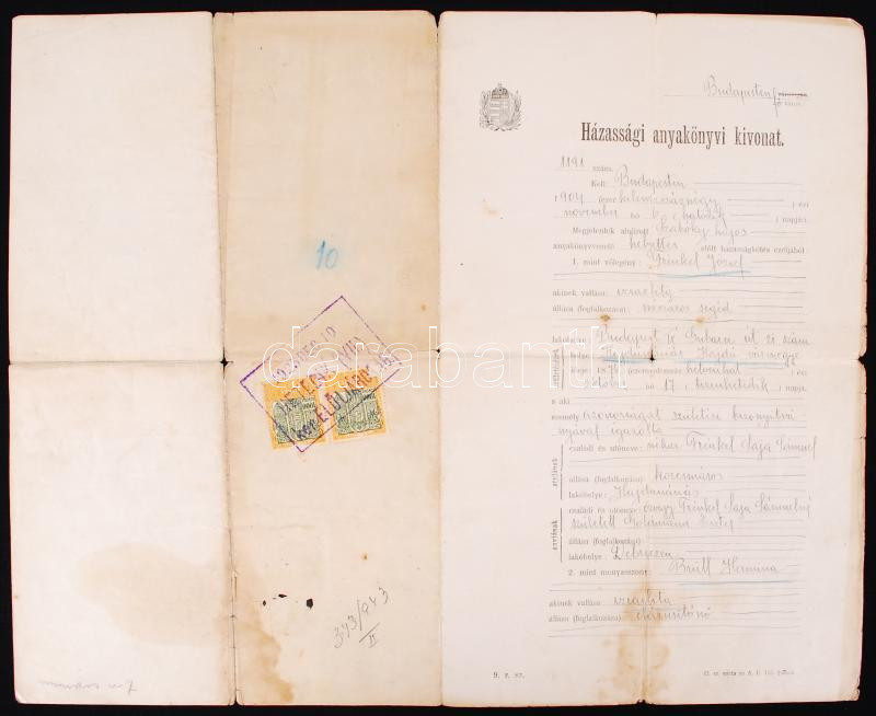 https://www.darabanth.com/en/187-Online-auction/187.0/Other-collectibles/Documents~6000015/1925-Hazassagi-anyakonyvi-kivonat-budapesti-illetekbelyeggel~II690156