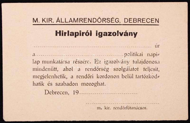 https://www.darabanth.com/en/187-Online-auction/187.0/Other-collectibles/Documents~6000015/Hirlapiroi-igazolvany-MKirAllamrendorseg-Debrecen~II689553