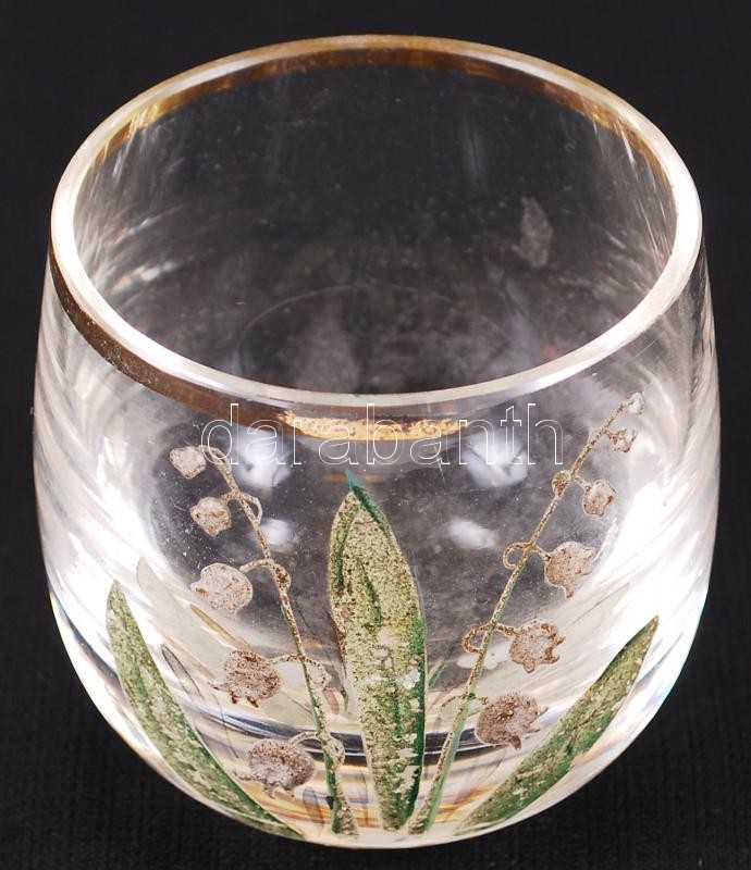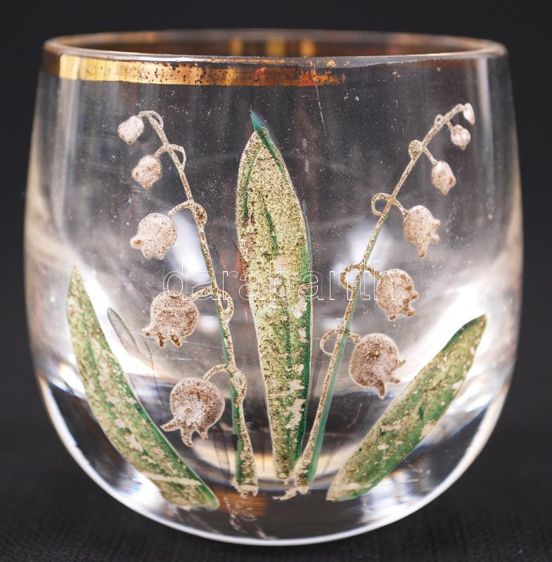 Gyöngyvirággal díszített, kézzel festett, aranyozott üvegpohárka /