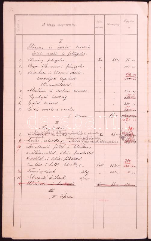 cca 1880 Vasúttörténeti dokumentum: A barcstelep-kapronczai h[elyi]. é[rdekű]. vasut részletes költségvetése. Kézirat