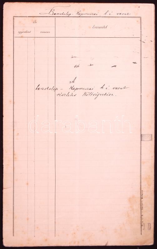 cca 1880 Vasúttörténeti dokumentum: A barcstelep-kapronczai h[elyi]. é...