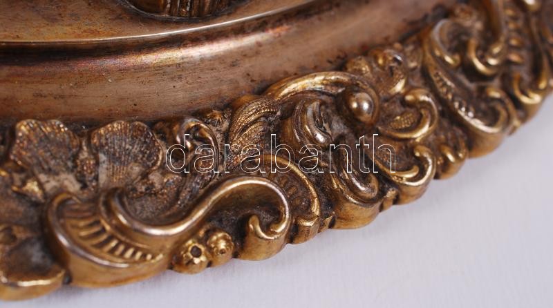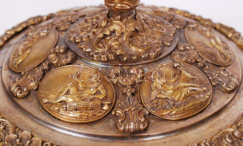 Description: Aranyozott ezüst (Ag.) gyümölcstál fedő, antik osztrák jelzéssel (1836), mesterjellel (STM, Stephan Majerhof)), trébelt, gazdagon díszített, nettó: 600 gr., d:21 cm