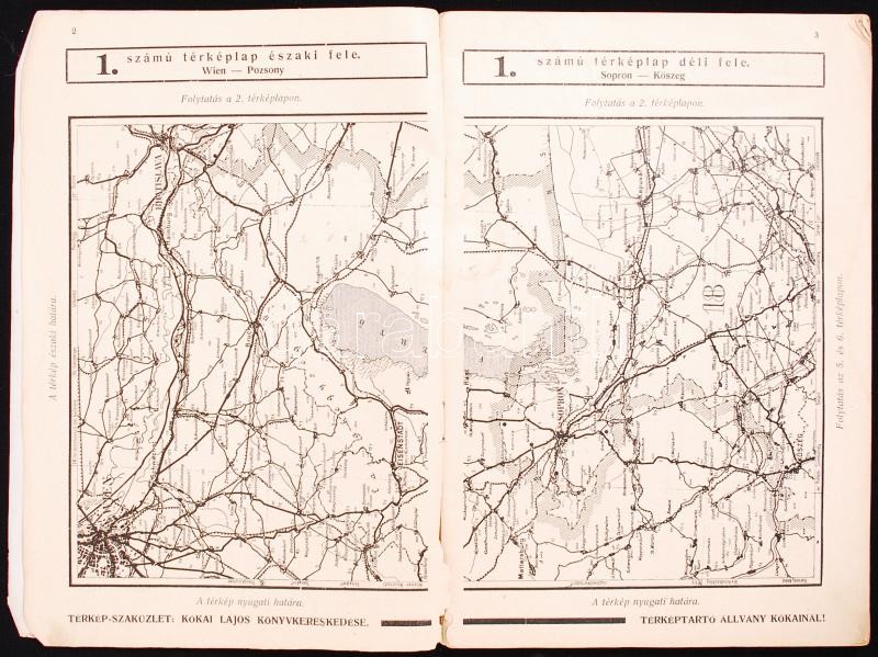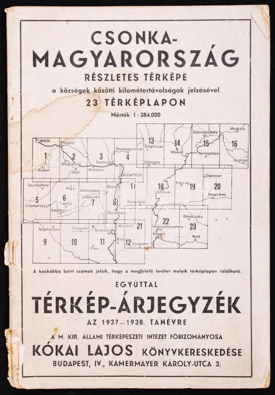 Description: Csonka Magyarország részletes térképe 1937-1938. A községek közötti kilométertávolságok jelzésével 23 térképlapon. Méretek 1:384.000. Bp., é.n. Kókai Lajos könyvkereskedése.