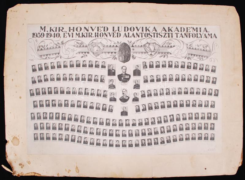 Description: 1939-1940 "A M. Kir. Honvéd Ludovika Akadémia 1939-1940 évi m. kir. honvéd alantostiszti tanfolyama", tablókép vitéz Kisbarnaki Farkas Ferenc (1892-1980) akadémiai parancsnok képével, és 196 további feliratozott portréval, kartonra kasírozva, 40x54,5cm
