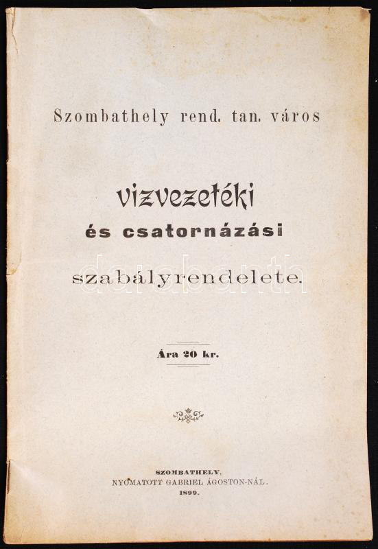 1899 Szombathely rend. tan. város vizvezetéki és csatornázási szabályrendelete. Szombathely, 1899, nyomtatott Gabriel Ágoston-nál. Tűzve, 20p.