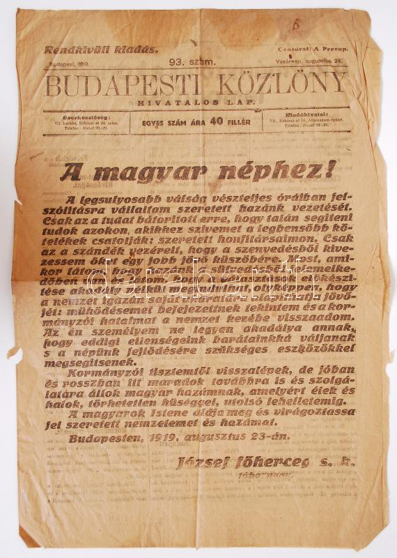 https://www.darabanth.com/en/187-Online-auction/187.0/Other-collectibles/Printed-Materials~6000026/1919-A-Budapesti-Kozlony-Hivatalos-lap-Rendkivuli-kiadas-Jozsef-foherceg-felhivasaval-~II689867