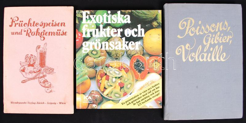 3db idegen nyelvű szakácskönyv Német, Francia és Svéd nyelveken. Gisa v Barsewisch: Exotiska frukter och grönsaker. H.n., 1985, ICA bokförlag kiadó. Früchtespeisen und Rohgemüse. Zürich / Leizig / Wien, 1937, Wendepunkt kiadó. Poissons, gibier et volaille. 2. kiadás. Paris-Strasbourg, é.n., Sanitas S. A. kiadó.