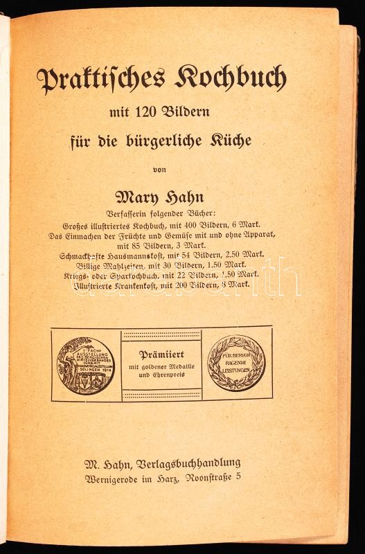 Mary Hahn: Praktisches. Kochbuch. 120 képpel. Wernigerode, ~1900, k.n.. Német nyelvű könyv, megviselt borítóval, belső rész hibátlan.