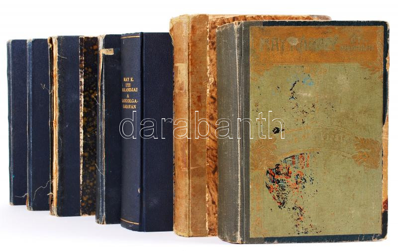 Description: 7db Karl May könyv: Az ezüsttó kincse; A Szkipetárok földjén; Karácsony; A Balkánon; Bagdadtól Sztambulig; A rabszolgakaraván; Az olajkirály. Bp, Atheneum irodalmi és nyomdai Rt, 1908-1913. Többnyire újrakötve, sérült állapotban