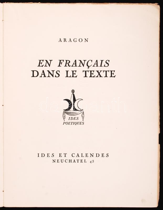 Aragon: En francais dans le texte. Neuchatel, ~1940, k.n.. Francia nyelvű könyv, számozott: 679/1500, fűzött, papírkötésben.