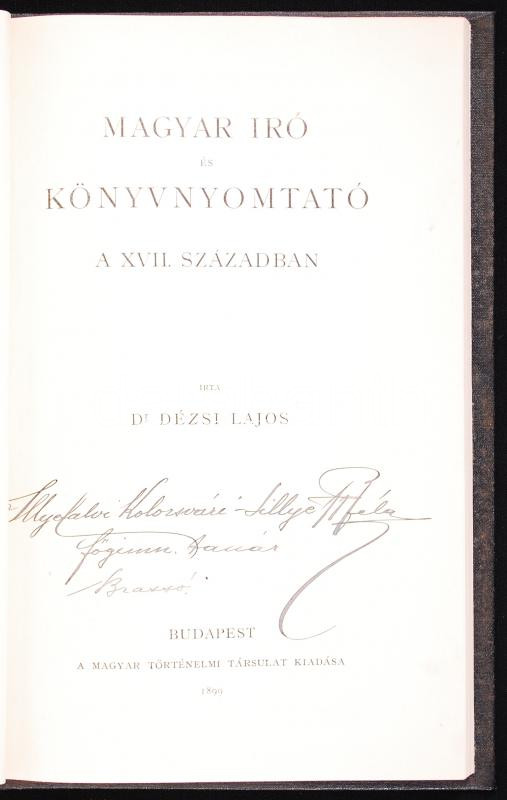 Description: Dézsi Lajos: Magyar író és könyvnyomtató a XVII. században: Pápai Páriz Ferenc (1649-1716). Budapest, 1899, Magyar történelmi társulat. Szövegközti és egészoldalas képekkel illusztrálva, amatőr vászonkötésben, címlapon tulajdonosi bejegyzés.
