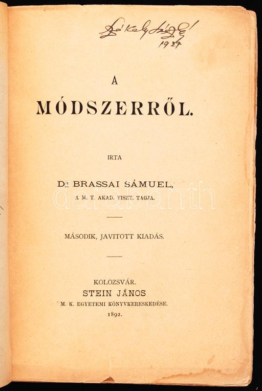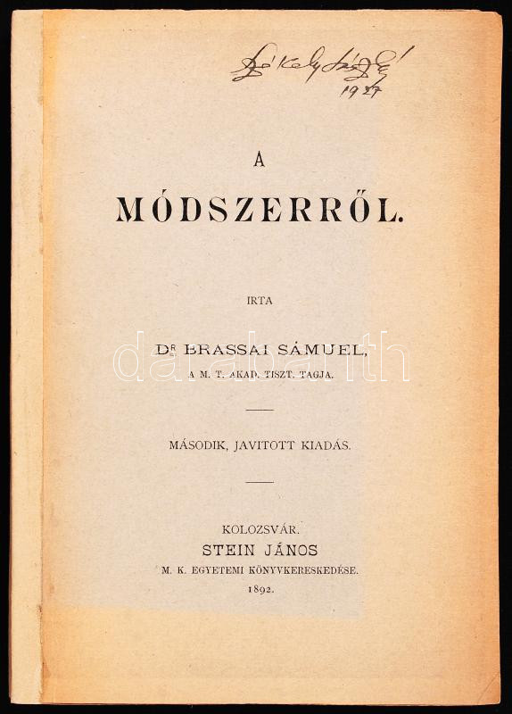Dr. Brassai Sámuel: A módszerről. Második, javított kiadás. Kolozsvár,... https://www.darabanth.com/en/188-Online-auction/188.0/Other-collectibles/Books-Other-rarities~15000040/Dr-Brassai-Samuel-A-modszerrol-Masodik-javitott-kiadas-Kolozsvar-1892-Stein-Janos-M-~II697662