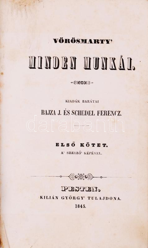 Vörösmarty Mihály: Minden munkái. Kiadák barátai Bajza József és Sched... https://www.darabanth.com/en/188-Online-auction/188.0/Other-collectibles/Books-Other-rarities~15000040/Vorosmarty-Mihaly-Minden-munkai-Kiadak-baratai-Bajza-Jozsef-es-Schedel-Ferenc-3Cbr3EElso-~II700376