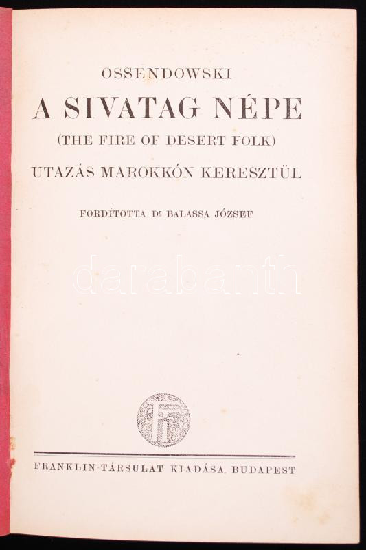 Ferdinand Ossendowski: A sivatag népe. (The fire of desert folk). Utaz... https://www.darabanth.com/en/188-Online-auction/188.0/Other-collectibles/Books-Travelling-cities~15000027/Ferdinand-Ossendowski-A-sivatag-nepe-The-fire-of-desert-folk-Utazas-Marokkon-keresztul-Bud~II698637