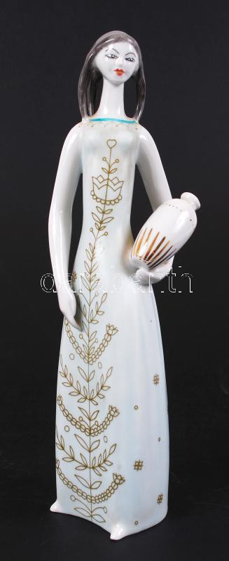Kézzel festett, jelzett, Hollóházi korsót vivő leányt ábrázoló porcelán figura, aranyozott díszítéssel / Hand painted, marked girl with jug 28cm