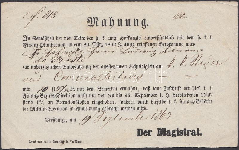 1863 Mahnung. Fizetési felszólítás a pozsonyi városi hatóságtól