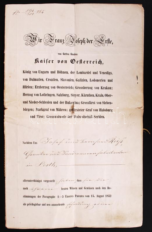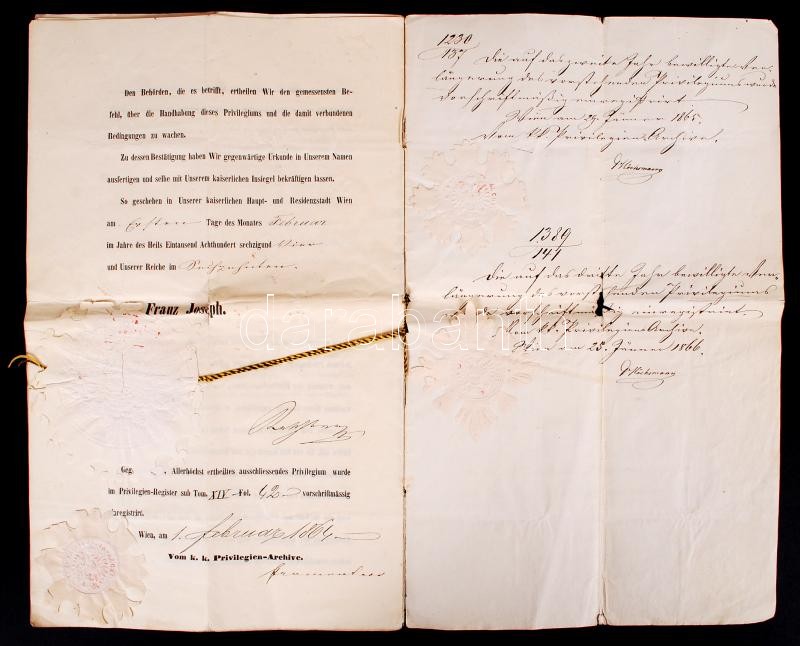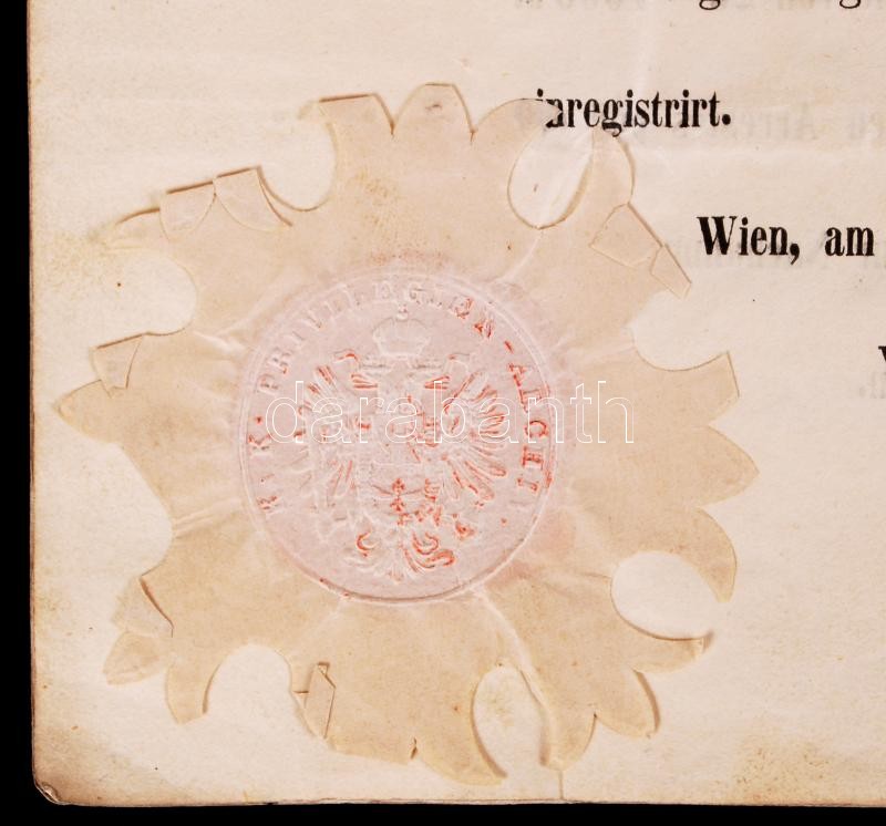 1864 Privilégiumlevél pesti gyufagyár részére kétszer megerősítve /