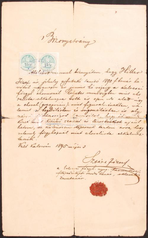 1895 Bizonyítvány 50kr okmánybélyeggel és lovag Sztára József zeneszer...