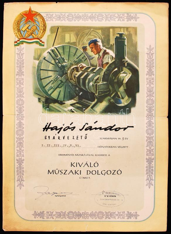 https://www.darabanth.com/en/188-Online-auction/188.0/Other-collectibles/Documents~15000014/1955-Kivalo-Muszaki-Dolgozo-oklevel-Hajos-Sandor-gyarvezeto-reszere-kiallitva~II697733
