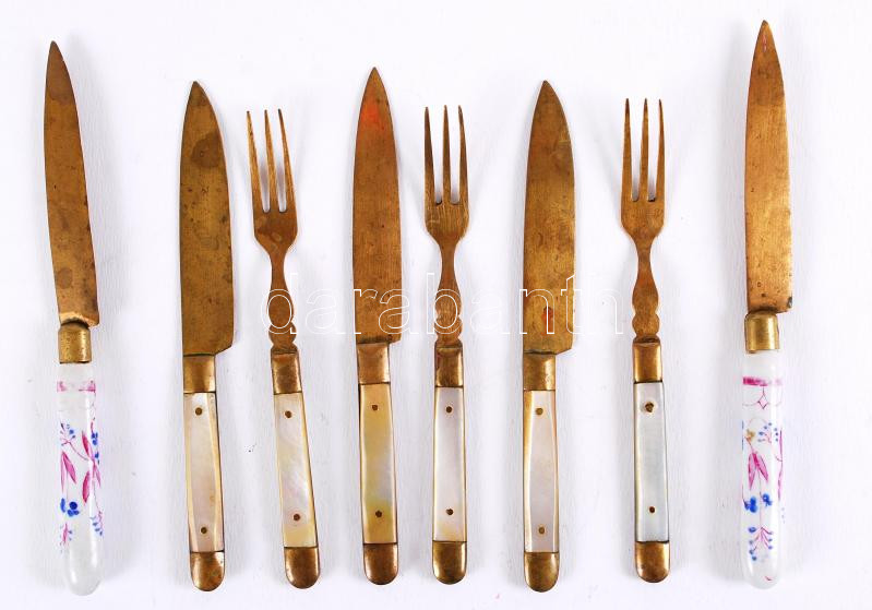 cca 1920 5db, jelzett, réz gyümölcskés 3db villával, közte 2db kézzel festett, porcelán nyelű és 6db gyöngyház-berakásos /