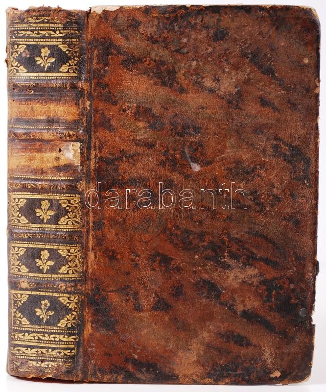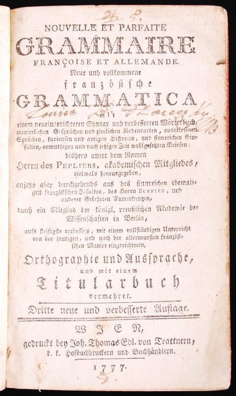 Description: Peplier: Nouvelle et parfaite grammaire francoise et allemande. Neue und volkommene frazösische Grammatica. Dritte neue und verbesserte Auflage. Wien, 1777, gedruckt bey Joh. Thomas Edl. von Trattnern. Korabeli bordázott, dombornyomott, aranyozott gerincű egészbőr kötésben, festett lapszélekkel, a címlapon és az előzéklapon szerzői bejegyzéssel. A kötés szélei és sarkai erősen kopottak