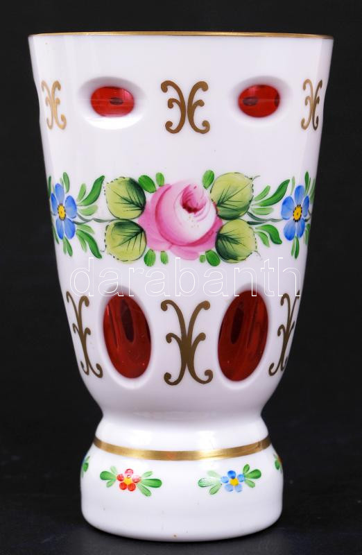 Emlék pohár, több rétegű, metszett, kézzel festett, hibátlan, m:13 cm