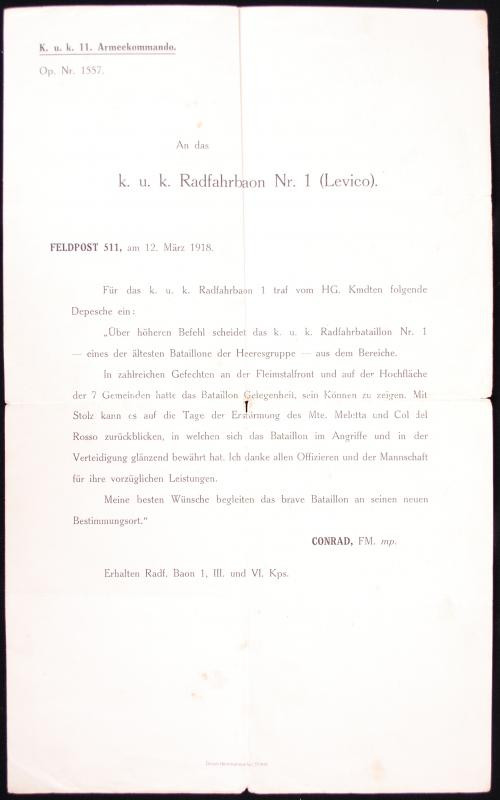 1918 Conrad tábornok dícsérete hadiparancsban a k.u.k. 11. armeekommando. I.sz. kerékpárosszakasznak Nabresinába
