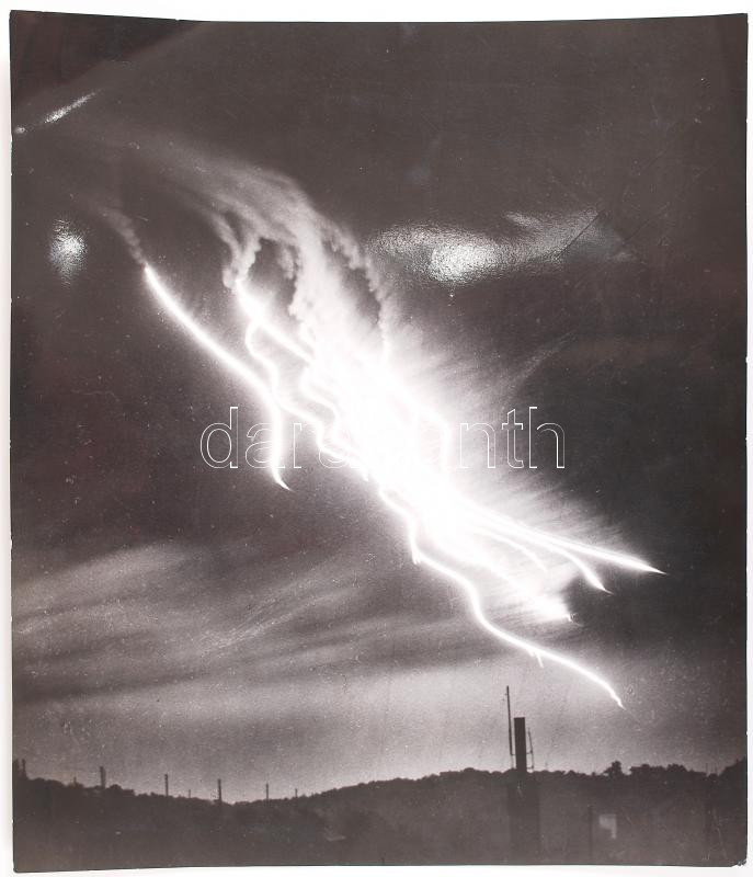 Description: 1944-45 Bruekner Zoltán: Fények a háborúból. (Ejtőernyős, világító bombákról a II. világháborúból). Vintage fotó, hátulján a soproni fotóklub pecsétje, 31x27 cm