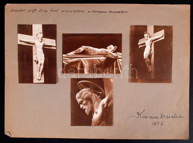 Description: 1908 Kozma Erzsébet síremlék tervéről készült 4db kisméretű fotó, klf. méretekben (feszület, gróf Zichy Jenő síremléke a Kerepesi temetőben) Kozma Erzsébet aláírásával. A fotók felragasztva egy nagyobb papírra.