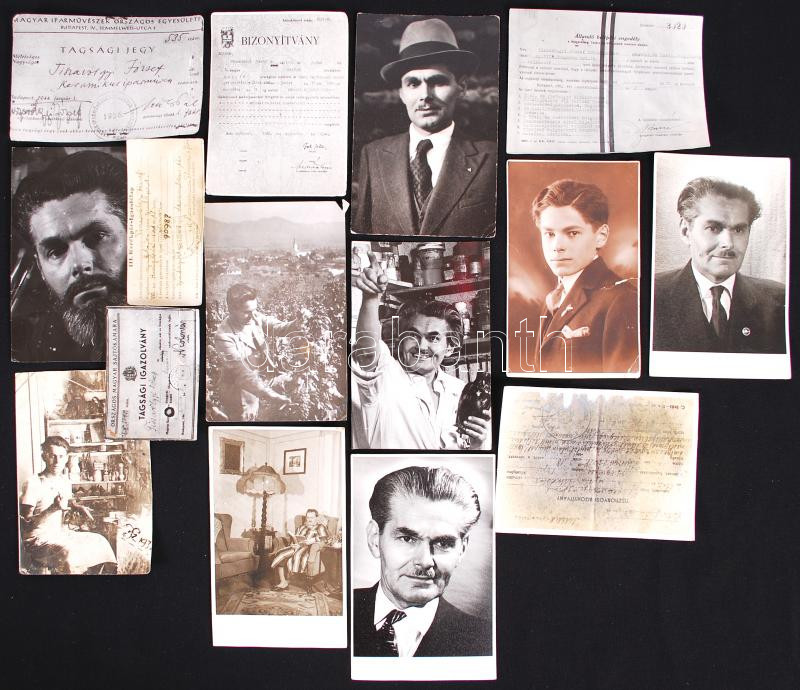 1940-1990 9db kfl méretű portréfotó Tiszavölgyi József fotóriporterről, köztük 3 db pecséttel jelzett, továbbá 6db repró az okmányairól
