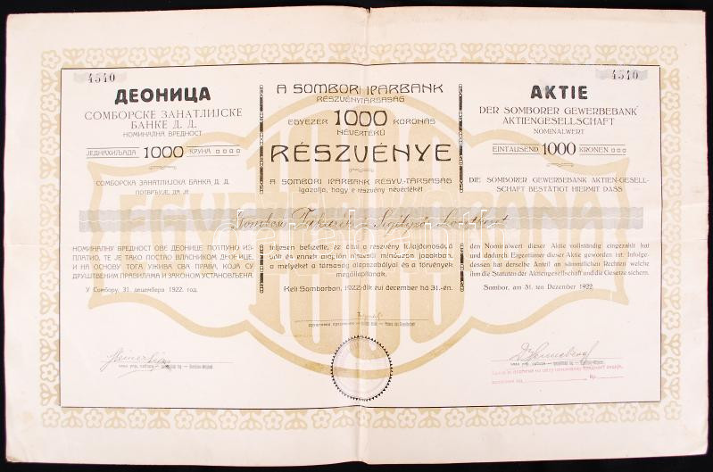 1922 A Sombori Iparbank 1000 Korona értékű Részvénye