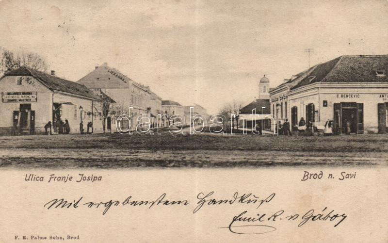 Bród, Brod na Savi; Franz Joseph street, the shops of Samuel Mautner and Bencevic