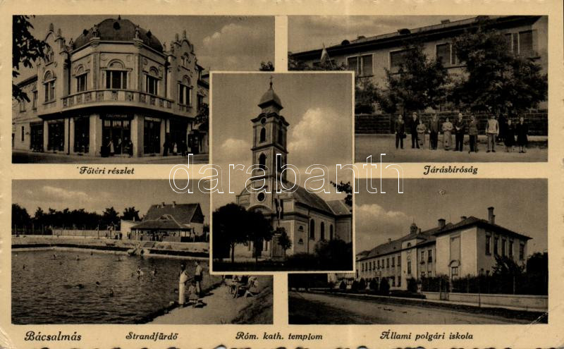 Bácsalmás Főtér, Járásbíróság, strand, Róm. kat. templom, iskola (EB)