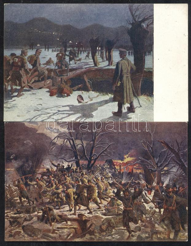 Description: 2 db régi, használatlan, első világháborús képeslap a 30. honvéd gyalogezredről, pinx. Novák Sándor, Juszkó Béla / 2 unused, WWI postcards about the Hungarian 30th infantry regiment, pinx. Novák Sándor, Juszkó Béla